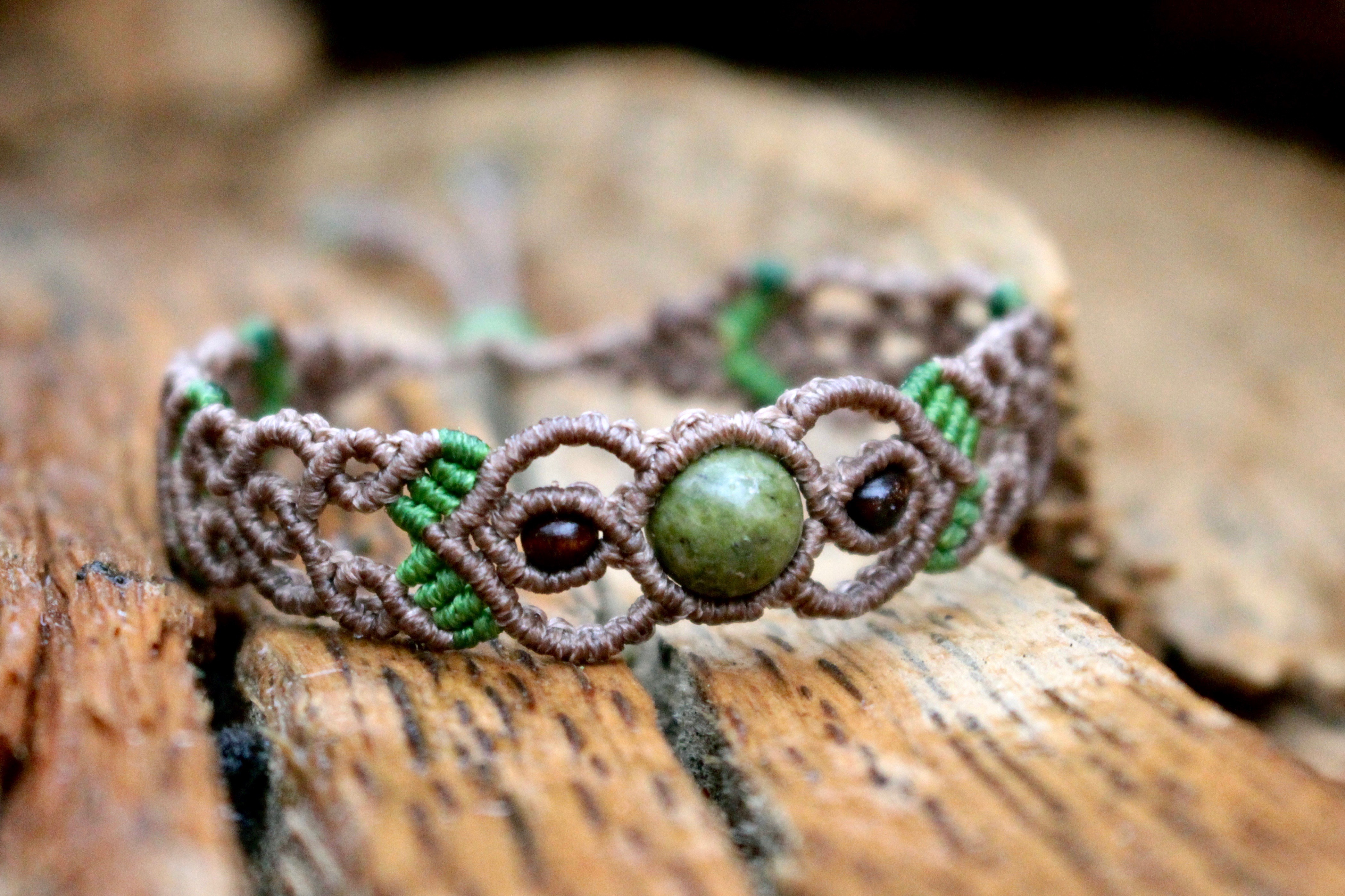 Bracelet orné d’une perle en unakite et de perles en bois, il est ajustable à tous les poignets grâce à un réglage en macramé.