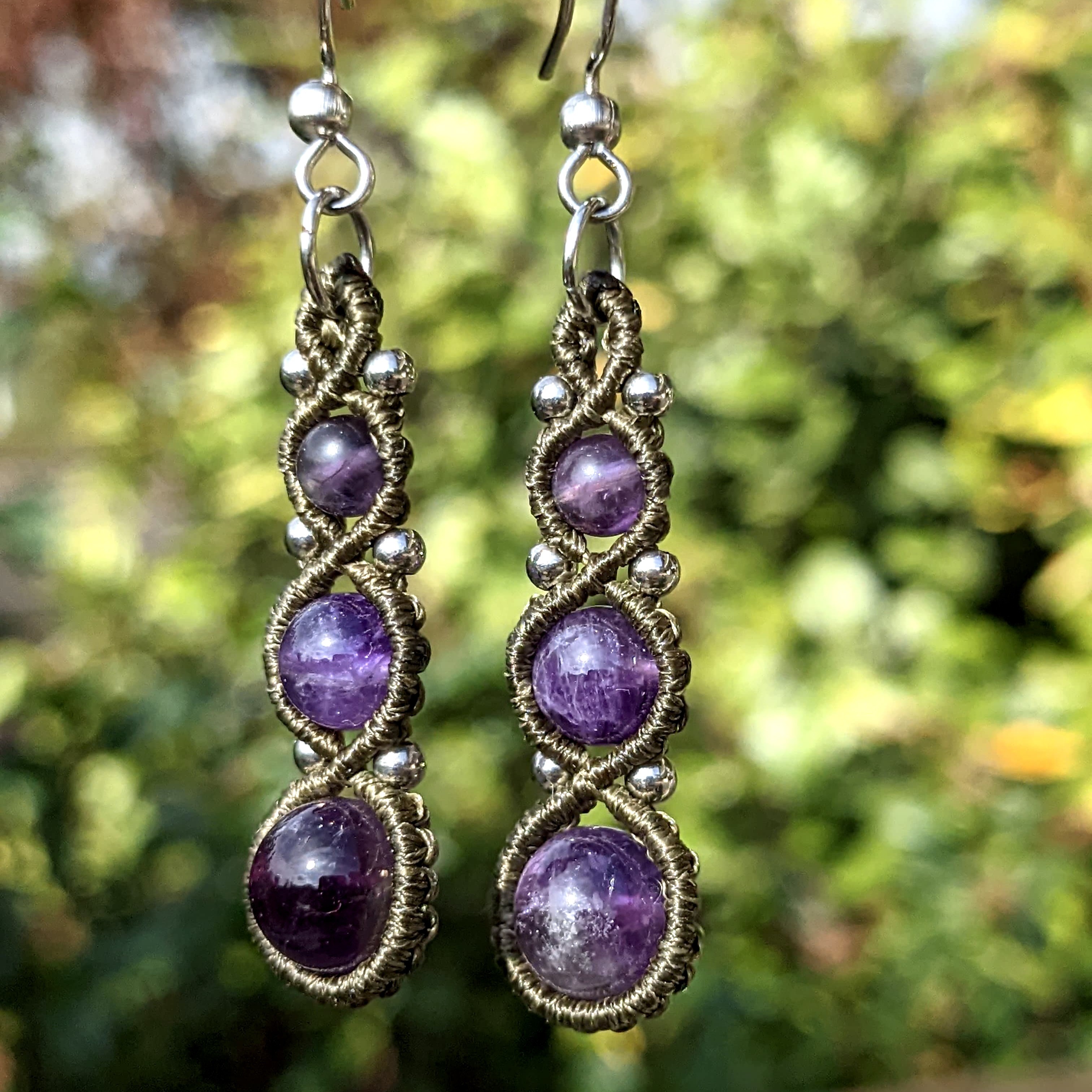 Ces boucles d'oreilles, dans l'esprit du bracelet " Toru ", sont ornées de perles en améthyste.
